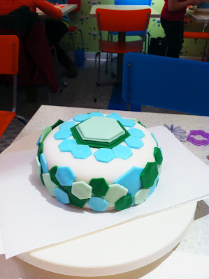 Then I found this cake, decorated with colorful fondant hexies, by Maggie at VibranceandChaos.