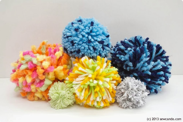 I put an exclamation point at the end of “pom-poms” above as it’s incredibly hard to talk about pom-poms without some enthusiasm – they’re so fun! Take these for example. Cheryl at SewCanDo made these as part of a book review. She used embroidery floss, baker’s twine, standard yarn, and chunky variegated yarn to make these funky poms.