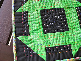 I have to admit it’s hard to see in the photos, but it’s easy to grasp how the variegated thread they used would add some nice visual interest to this bold and bright Anchor Quilt at PieceNQuilt.
